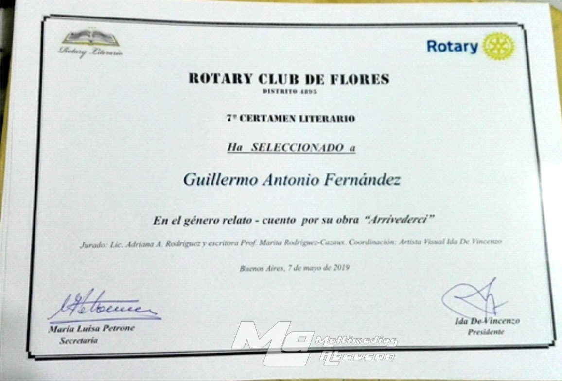 El notorio escritor local, conocido en el mundo de la ficción bajo el seudónimo de ‘Ignacio Martín Lui’ acaba de obtener una nueva distinción, esta vez por parte del Rotary Club de la ciudad de Flores, de la ciudad de Buenos Aires, entre más de 500 escritores de 14 países en el “7° Certamen Literario Internacional 2019”.