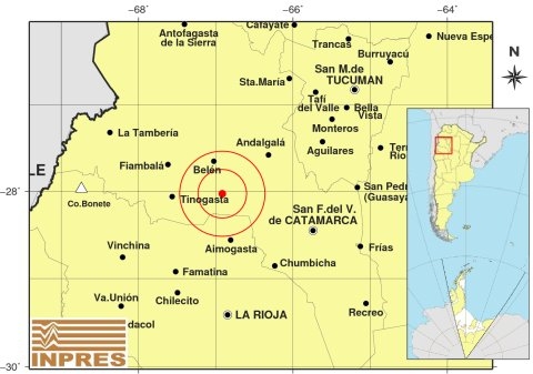 Epicentro: 89 Km. al NO de San F. Del Valle De Catamarca; 158 Km. al N de La Rioja; 51 Km. al S de Andalgalá -28.012 (lat) -66.501 (long)