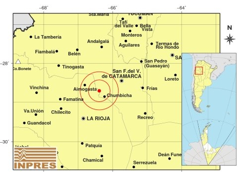 Epicentro: 69 Km. al SO de San F. Del Valle De Catamarca; 90 Km. al NE de La Rioja; 22 Km. al NO de Chumbicha -28.707 (lat) -66.387 (long)