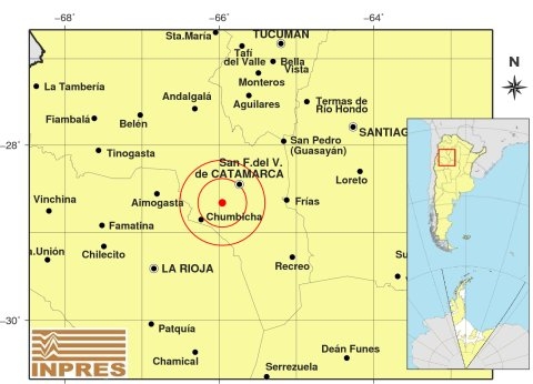 Epicentro: 32 km al SO de San F. Del Valle De Catamarca; 119 km al NE de La Rioja; 33 km al NE de Chumbicha -28.663 (lat) -65.961 (long)