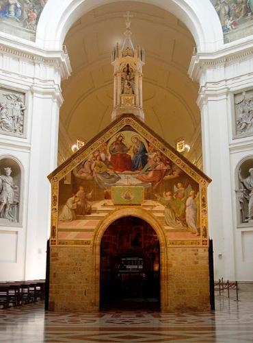 La concesión de la Indulgencia de la Porciúncula se dio en 1216, cuando San Francisco partió para Perusa junto al hermano Maseo para ver al Papa Honorio III. Una noche anterior el mismo Cristo y la Virgen, rodeados de ángeles, se le habían aparecido en la capilla de Santa María de los Ángeles en Asís.