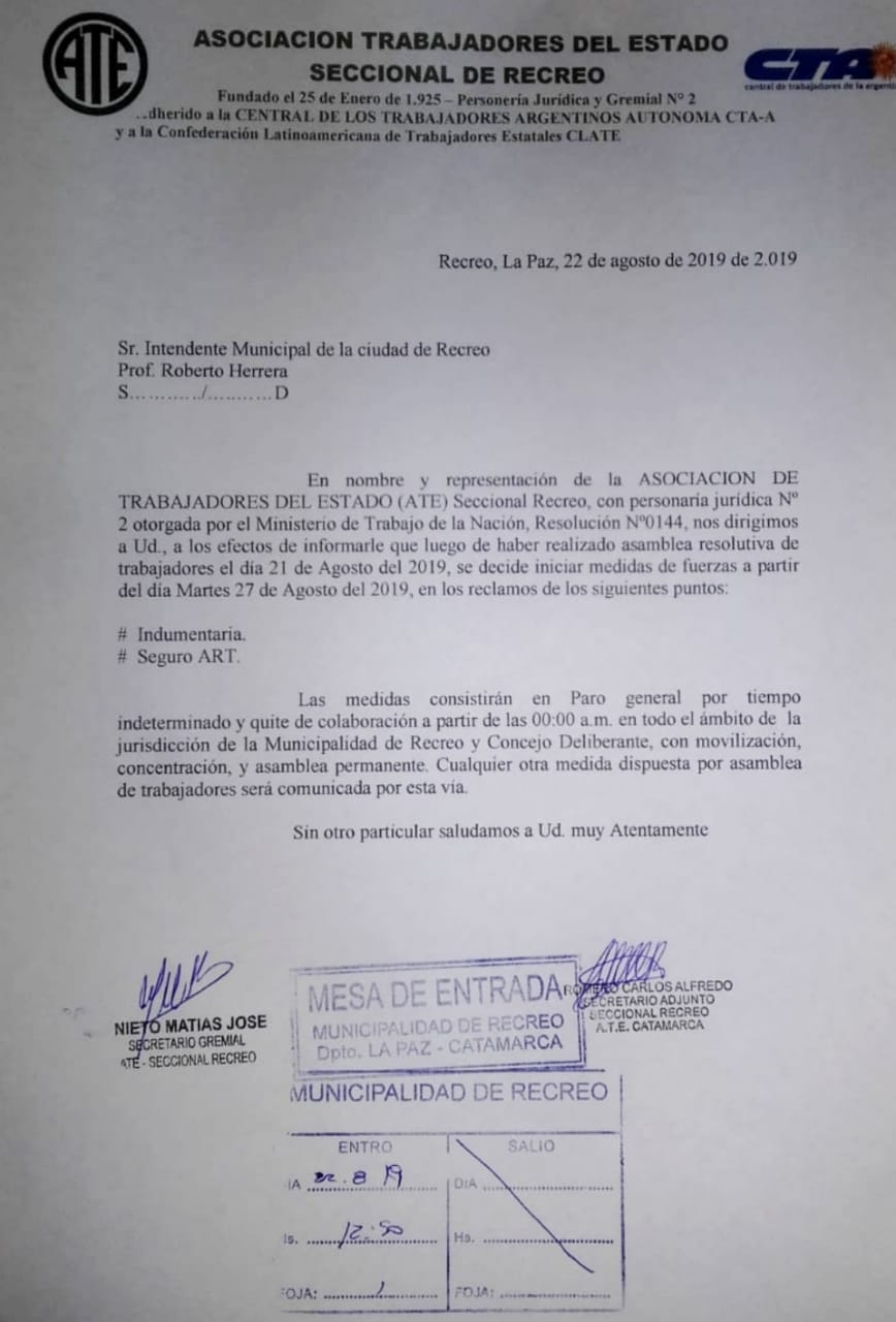 ATE Recreo, mediante asamblea en todo la jurisdicción, decidieron "declarar paro general por tiempo indeterminado" desde las 00 horas de hoy martes 27 de agosto, en el ámbito del Poder Ejecutivo Municipal de Recreo y Concejo Deliberante.