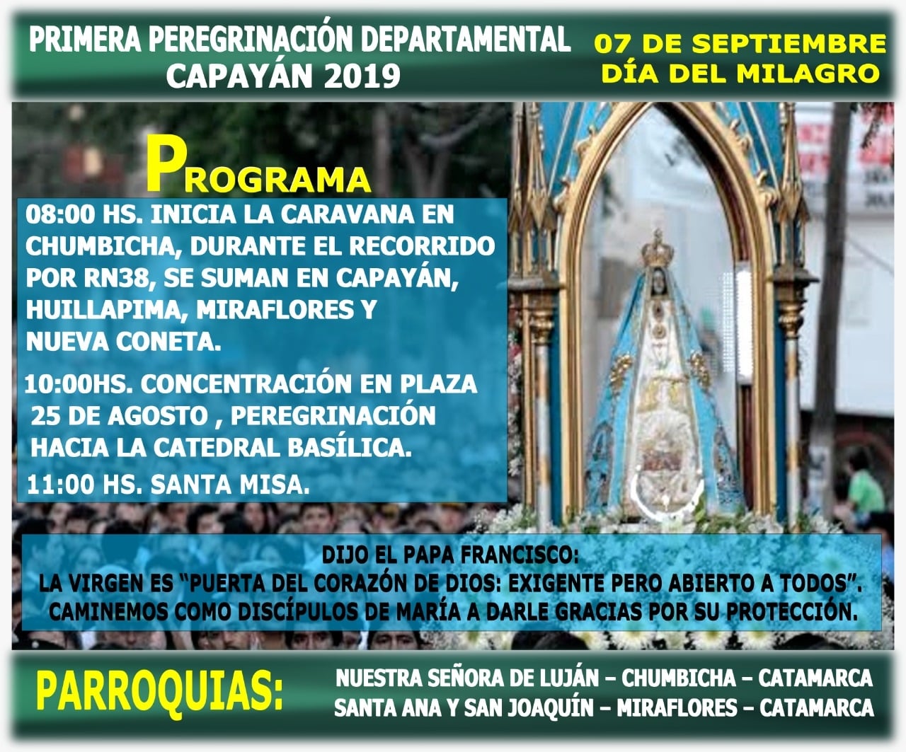 A las 8.00 iniciará la caravana en Chumbicha, y durante el recorrido por ruta nacional N° 38, los fieles se sumarán en Capayán, Huillapima, Miraflores y Nueva Coneta.