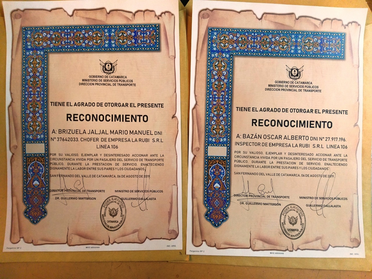 El inspector, Oscar Alberto Bazán y el chofer, Mario Manuel Brizuela Jaljal de la línea 106 interno 15 de la empresa La Rubí, recibieron el reconocimiento del ministro Dalla Lasta entendiendo que muchos choferes en su actividad cotidiana realizan distintos tipos de acciones periféricas a la conducción de las unidades. Con este acto se pretende destacar las acciones humanas frente a los pasajeros que comparten la labor de los choferes día a día.