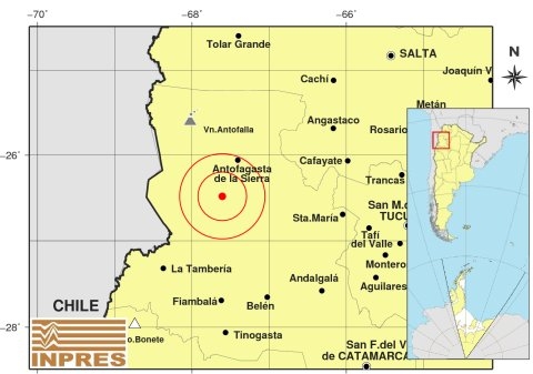 Epicentro: 242 Km. al O de San Miguel De Tucumán; 286 Km. al NO de San F. Del Valle De Catamarca; 52 Km. al SO de Antofagasta De La Sierra -26.482 (lat) -67.606 (long)