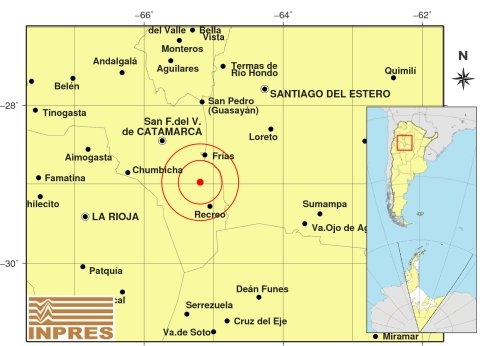 Epicentro: 79 Km. al SE de San F. Del Valle De Catamarca; 160 Km. al SO de Santiago Del Estero; 36 Km. al NO de Recreo -28.978 (lat) -65.194 (long)