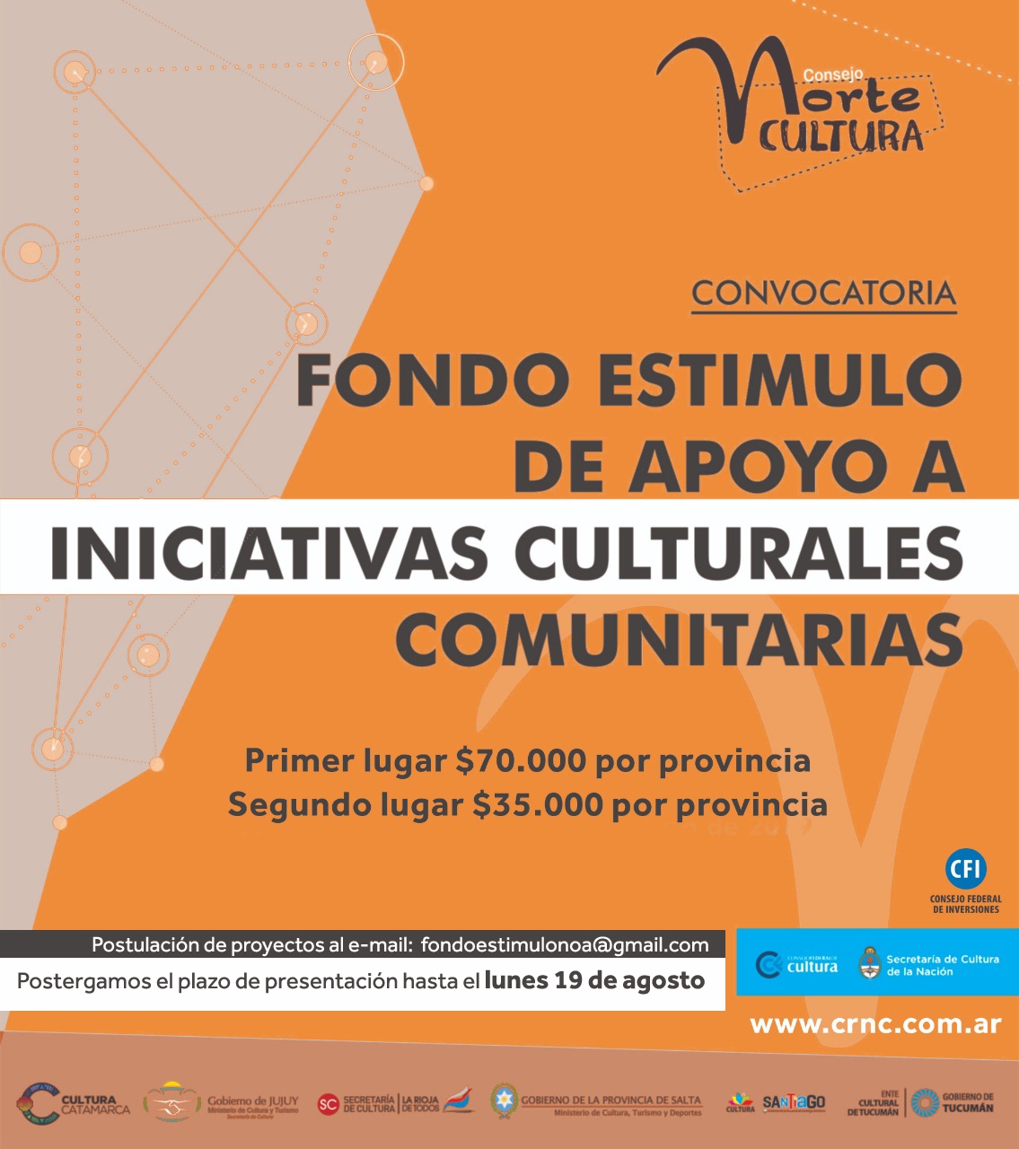 Debido a la gran cantidad de consultas y solicitudes, el Consejo Regional Norte Cultura dispuso la postergación del plazo de la presentación de proyectos hasta el 19 de agosto inclusive. La modalidad de presentación es a través del correo electrónico [email protected] (deberán enviarse en los formatos especialmente elaborados para la convocatoria).