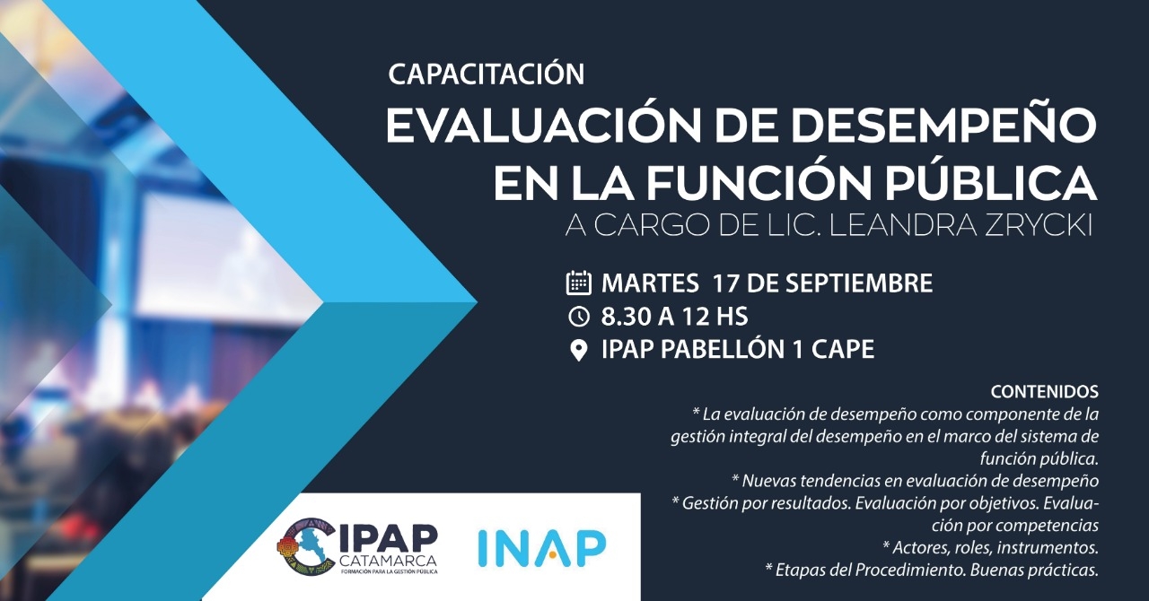 La capacitación será el martes 17 de septiembre, de 8.30 a 12 hs, en el auditorio de IPAP (Pabellón 1 del CAPE) y estará a cargo de la Licenciada Leandra Zrycki, asesora especializada en Evaluación de Desempeño de la Oficina Nacional de Empleo Público de la Secretaría de Modernización de la Nación.