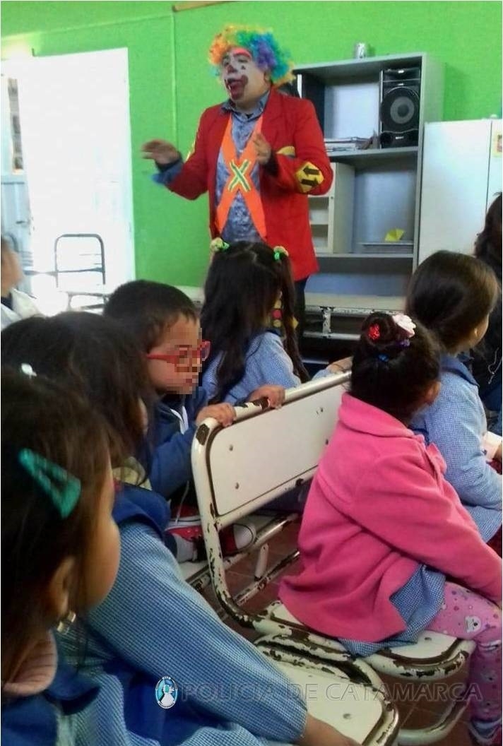 Finalmente, el simpático personaje "Payaso Velocin" llegó junto al personal de la Dirección de Seguridad Vial de la Policía de la Provincia hasta la escuela primaria N° 249 de la Villa de Ancasti, y a través de juegos y actividades recreativas, dejaron mensajes preventivos para los más pequeños de la casa.