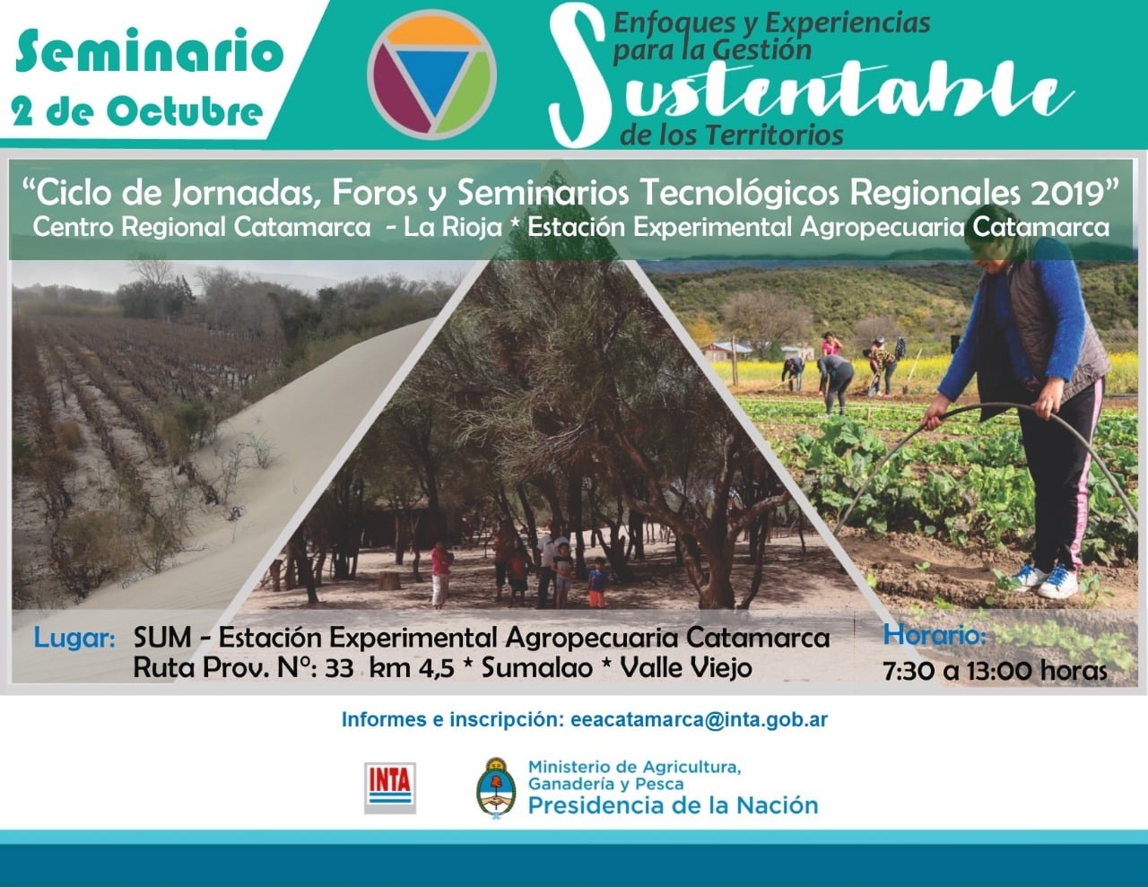 En el marco del “Ciclo de Jornadas, Foros y Seminarios Tecnológicos Regionales 2019”, el próximo 2 de octubre se llevará a cabo el Seminario-Taller “Enfoques y experiencias para la gestión sustentable de los territorios”, en la Estación Experimental Agropecuaria Catamarca, sito en Km. 4 Sumalao, Valle Viejo.