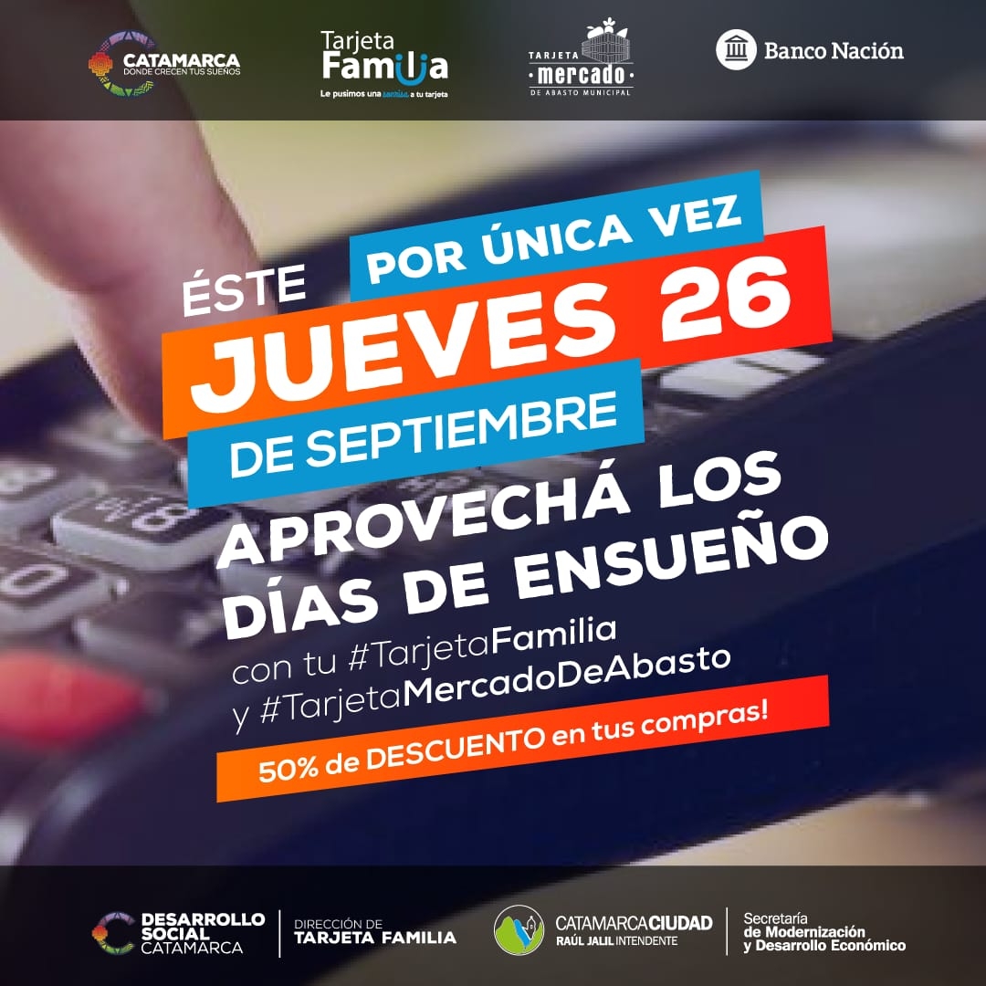 Asimismo, y por única vez, la promoción “Días de Ensueño”, que se lleva adelante en conjunto con el Banco Nación, se realizará el día jueves 26 de septiembre para los beneficiarios de la Tarjeta Familia.