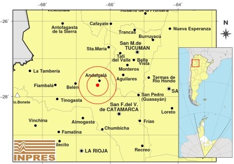 Epicentro: 104 Km. al NO de San F. Del Valle De Catamarca; 152 Km. al SO de San Miguel De Tucumán; 14 Km. al SO de Andalgalá -27.698 (lat) -66.373 (long)
