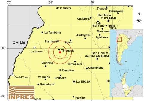 Epicentro: 153 km al NO de La Rioja; 178 km al O de San F. Del Valle De Catamarca; 12 km al S de Tinogasta -28.168 (lat) -67.522 (long)
