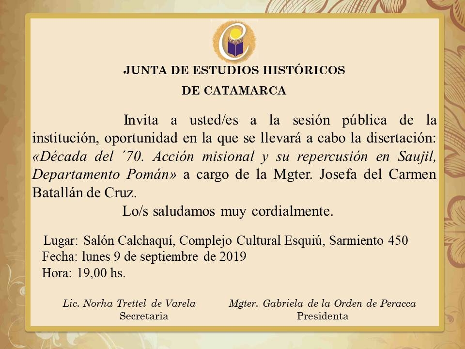 La Junta de Estudios Históricos de Catamarca invita a la sesión pública en la que se llevará a cabo la disertación “Década del ’70. Acción misional y su repercusión en Saujil, departamento Pomán”.