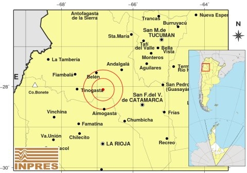 Epicentro: 116 km al O de San F. Del Valle De Catamarca; 148 km al N de La Rioja; 50 km al S de Belén -28.073 (lat) -66.839 (long)