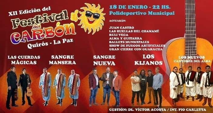lunes, 13 de enero de 2020 18:09 lunes, 13 de enero de 2020 18:09 El próximo 18 de enero se realizará la 12° Festival del Carbón. El evento se realizará en el Polideportivo Municipal de Quirós, Departamento La Paz.