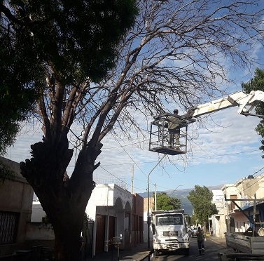 Personal especializado de la Secretaría de Urbanismo e Infraestructura que conduce Eduardo Aden Monferrán, con la maquinaria adecuada, trabajó intensamente en calle Chacabuco al 1000, donde un gigantesco árbol con posibilidades de caer representaba una amenaza para los vecinos.