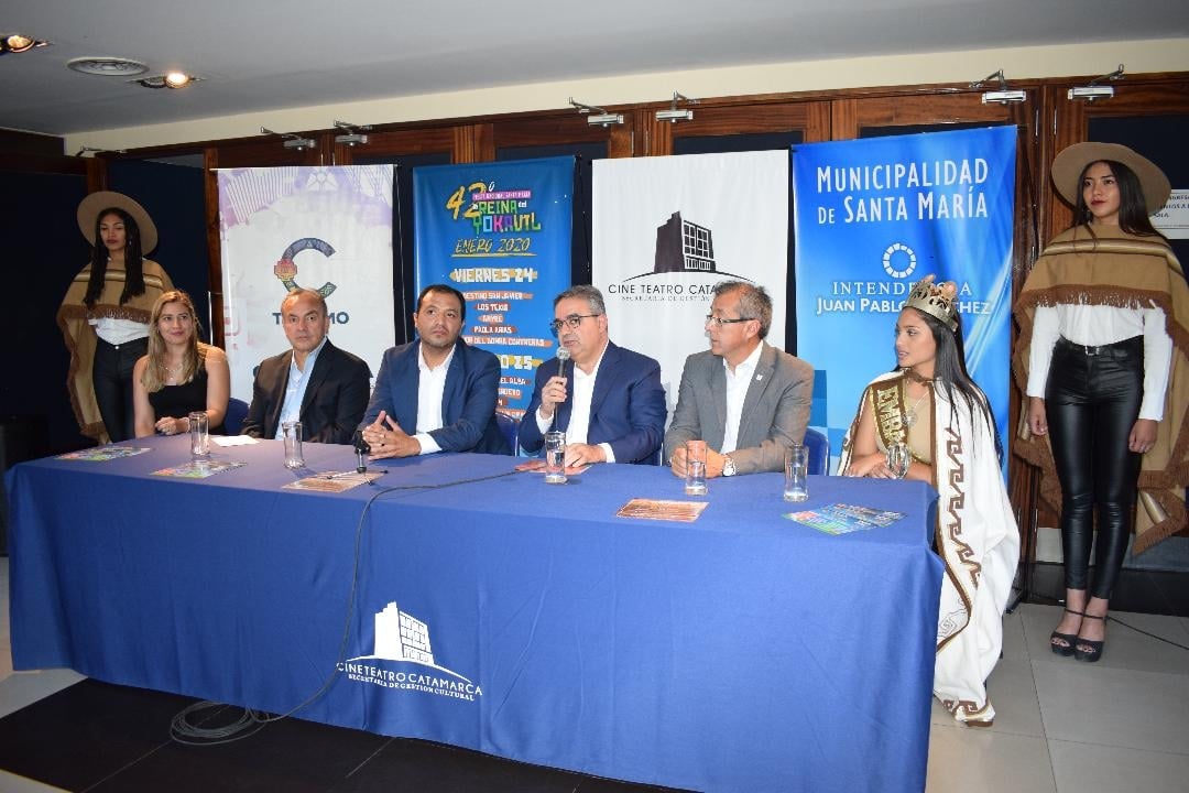 Con la presencia del señor gobernador de Catamarca, Lic. Raúl Jalil, quien estuvo acompañado por el Ministro de Gobierno y Justicia, Dr. Jorge Moreno, el Intendente de Santa María, CPN Juan Pablo Sánchez, la Secretaria de Gestión Turística de la provincia, Lic. Gabriela Coll, en representación del Ministro de Cultura y Turismo, Arq. Luis Maubecín, el Secretario de Cultura de Santa María, Claudio Velarde y la Embajadora Cultural y Turística del Yokavil, Paula Caceres, se presentó en la mañana de hoy en las instalaciones del Cine Teatro Catamarca, la edición número cuarenta y dos de la Fiesta Nacional, Santa María Reina del Yokavil que se realizara en el Anfiteatro “Margarita Palacios” entre el 24 y 26 de Enero.