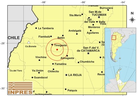 Epicentro: 133 km al N de La Rioja; 155 km al O de San F. Del Valle De Catamarca; 35 km al SE de Tinogasta -28.285 (lat) -67.311 (long)