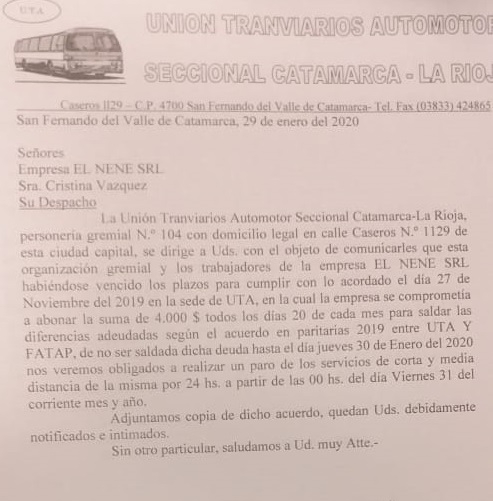 Roque Chanquia, delegado de la empresa confirmo que ya se notificaron las partes para realizar un paro por 24 horas el dia viernes 31 por el incumplimiento al pago de cuota $4000 acordados los días 20 de cada mes, hasta se cancele el pago de lo acordado en paritarias 2019.