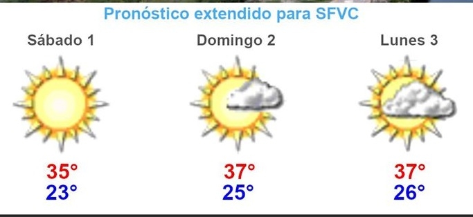 El cielo estará mayormente despejado en toda la provincia, aunque en las húmedas sierras comenzarán a aparecer muchas nubes desde el domingo, incrementándose cada día que pase. Algunas de estas nubes dejarán el cielo parcialmente nublado en el Valle Central.