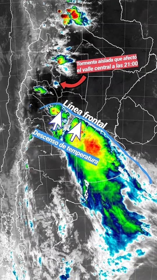 Pero como pueden ver en la imagen satelital, de las 21, una línea de inestabilidad (frente frío) va avanzando y llegará a nuestra provincia alrededor de las 3 de la madrugada del lunes, trayendo viento sur con ráfagas entre 40 y 50 km/h, chances de tormentas frontales y un descenso de temperatura que se reflejará en una máxima para hoy de no más de 29° en SFVC.