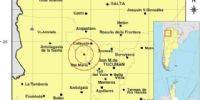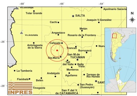 Epicentro: 112 km al NO de San Miguel De Tucumán; 193 km al SO de Salta; 37 km al NO de Sta.María -26.401 (lat) -66.227 (long)