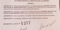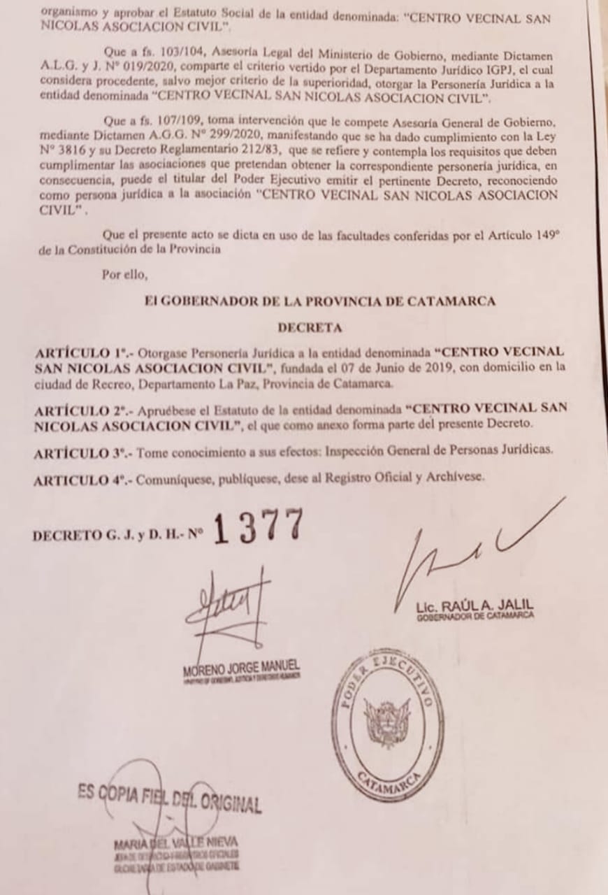 Días pasados, en la Capital provincial, el Centro Vecinal "San Nicolás" recibió la Personería Jurídica, firmada por el gobernador Raúl Jalil, Jorge Moreno y Alexis Burgos, Director de Personería Jurídicas de Catamarca, instrumento legal que los constituye como asociación civil y con autoridades como representante de la institución.