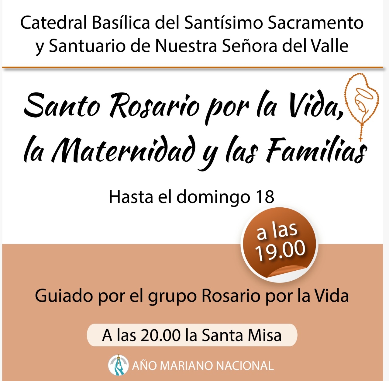 A las 19 se reza el Santo Rosario, guiado por integrantes del grupo Rosario por la Vida; y a las 20.00 se celebra la Santa Misa en el Altar Mayor, con transmisión a través de youtube y las redes sociales de la Catedral y el Obispado.