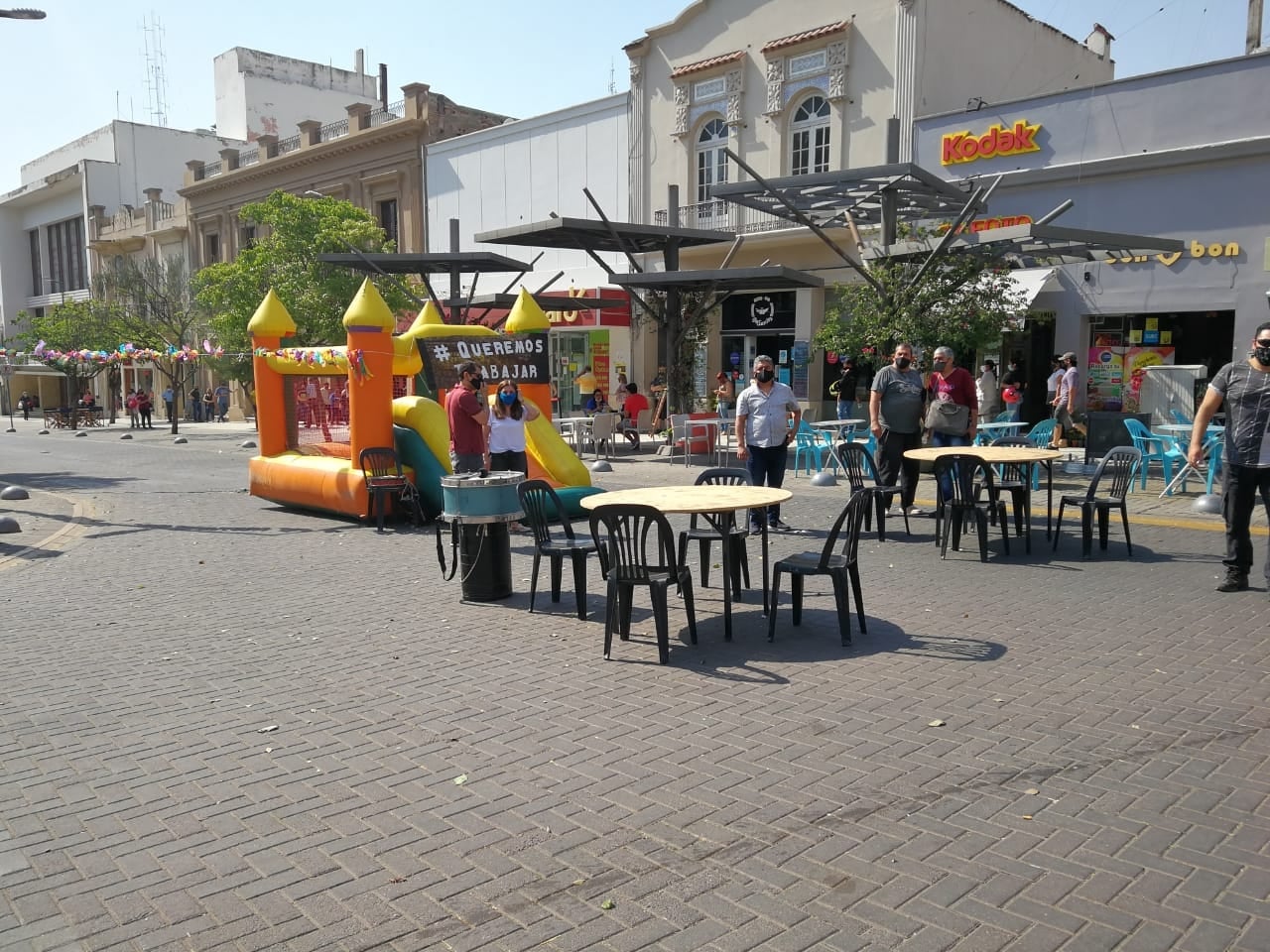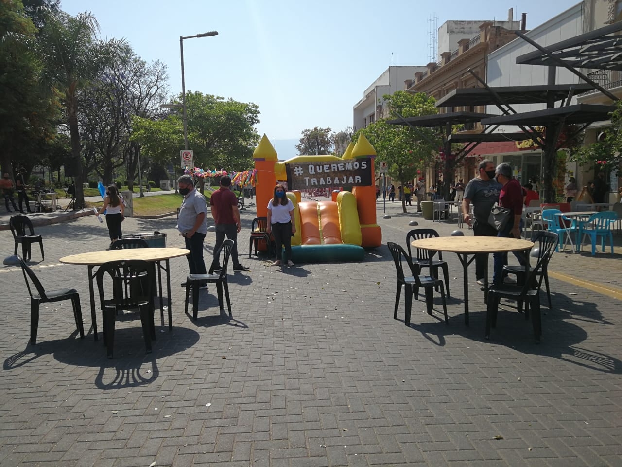 En la otra esquina, en San Martín y Sarmiento, se encuentran los propietarios de salones y las personas que subsisten de los eventos sociales, quienes le reclaman al gobierno provincial poder trabajar, ya que la actividad es nula desde que comenzó la pandemia.