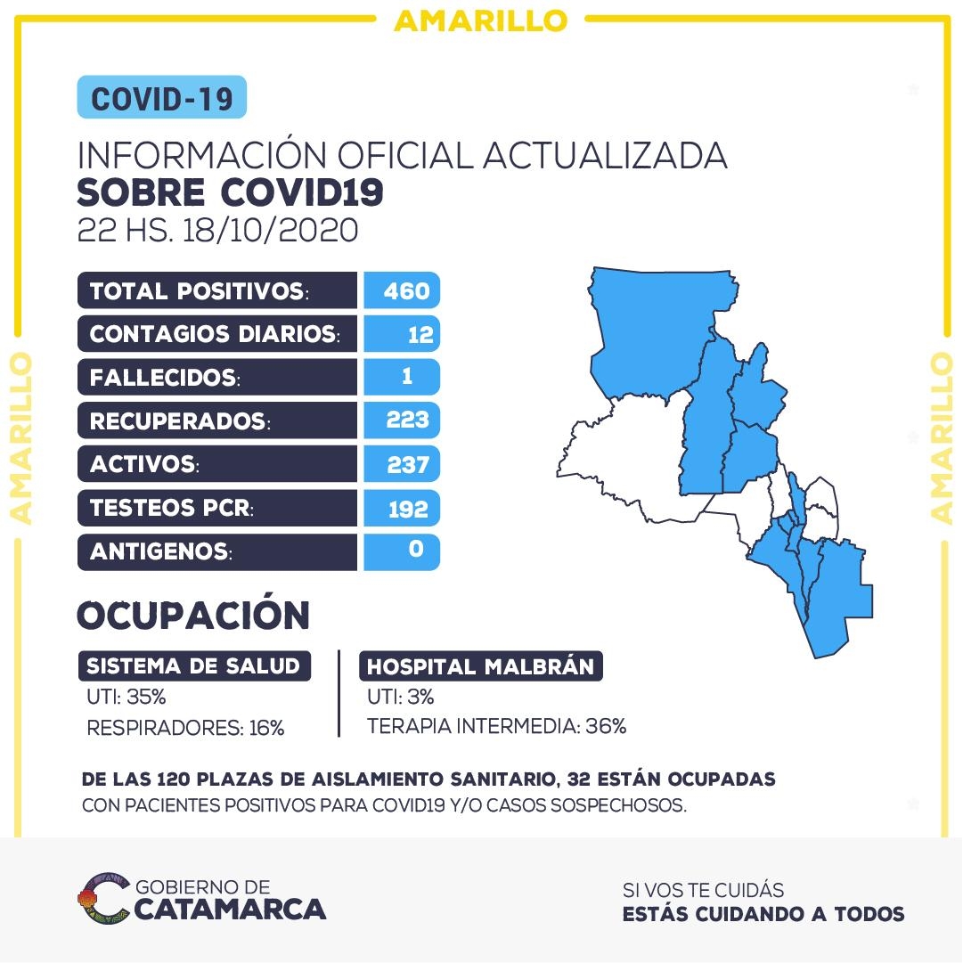 Hasta las 22 horas del domingo 18 de octubre, se han detectado 12 nuevos casos positivos de coronavirus en la provincia de Catamarca. El total acumulado de casos positivos detectados asciende a 460.