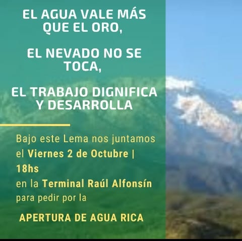 Ada Yapura, integrante de la Cooperativa de Trabajo Emprendedores del Oeste, indicó que bajo el lema “El agua vale más que el oro, El nevado no se toca, El trabajo dignifica y desarrolla”, se concentrarán en la terminal de ómnibus urbana Raúl Alfonsín para solicitar la puesta en marcha del emprendimiento Agua Rica.