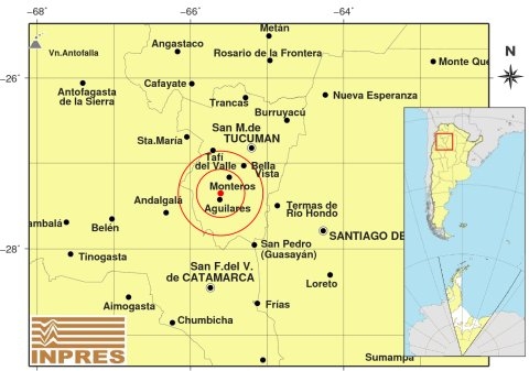 Epicentro: 72 km al SO de San Miguel De Tucumán; 122 km al N de San F. Del Valle De Catamarca; 7 km al N de Aguilares -27.354 (lat) -65.606 (long)
