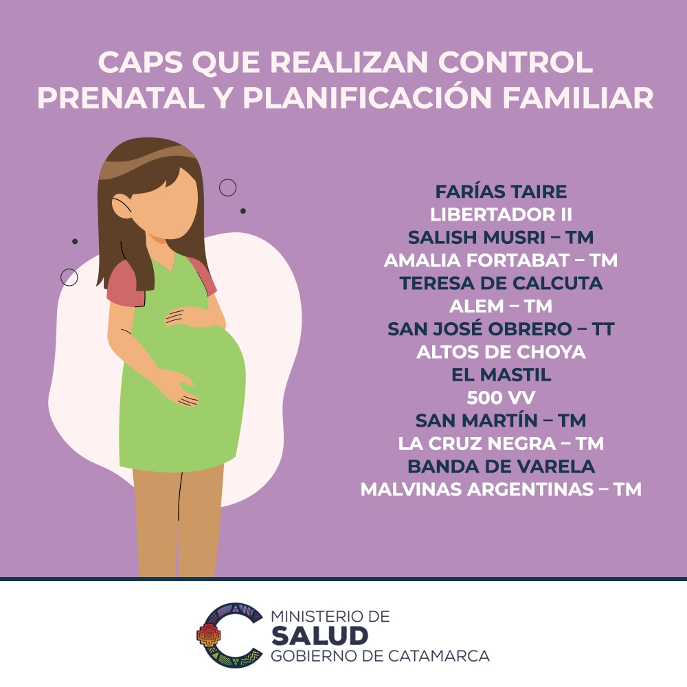 Los CAPS que cuentan con atención para controles prenatales son Farías Taire, Libertador II, Salish Musri (mañana), Amalia Fortabat (mañana), Teresa de Calcuta, Alem (mañana), San José Obrero (tarde), Altos de Choya, El Mastil, 500 vv, San Martín (mañana), La Cruz Negra (mañana), Banda de Varela, y Malvinas Argentinas (mañana).