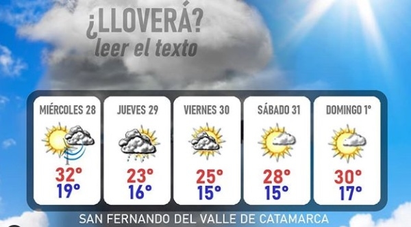 Mientras más nos vamos a la región Oeste, menos probabilidades de precipitaciones existen. Por ejemplo, para Tinogasta solo se observa cielo nublado para este período, mientras que para Andalgalá sí se ven chances de precipitaciones.