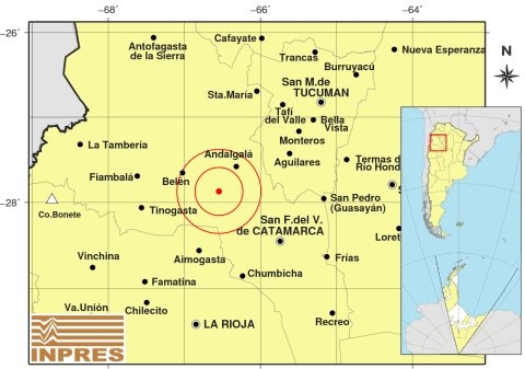 Epicentro: 102 km al NO de San F. Del Valle De Catamarca; 173 km al N de La Rioja; 40 km al SO de Andalgalá -27.871 (lat) -66.545 (long)