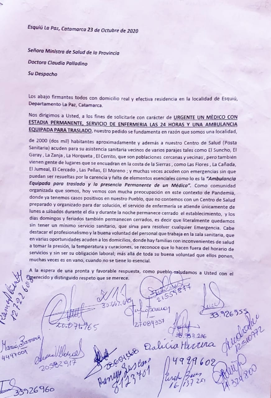 Los vecinos dan cuenta que Esquiú “está desamparado en tema salud, ya que no cuenta con nada para una emergencia médicas".