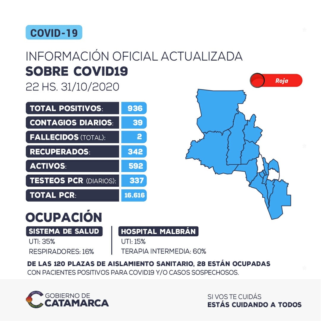 Hasta las 22 horas del sábado 31 de octubre, se han detectado 39 nuevos casos positivos de coronavirus en la provincia de Catamarca. El total acumulado de casos positivos detectados asciende a 936.