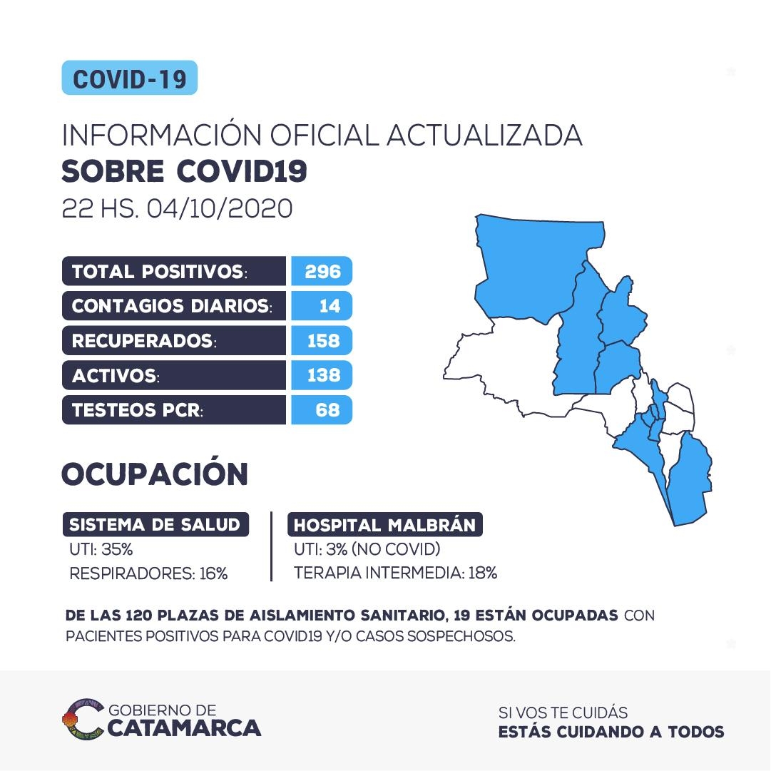 Hasta las 22 horas del domingo 4 de octubre, se han detectado 14 nuevos casos positivos de coronavirus en la provincia de Catamarca. El total acumulado de casos positivos detectados asciende a 296.