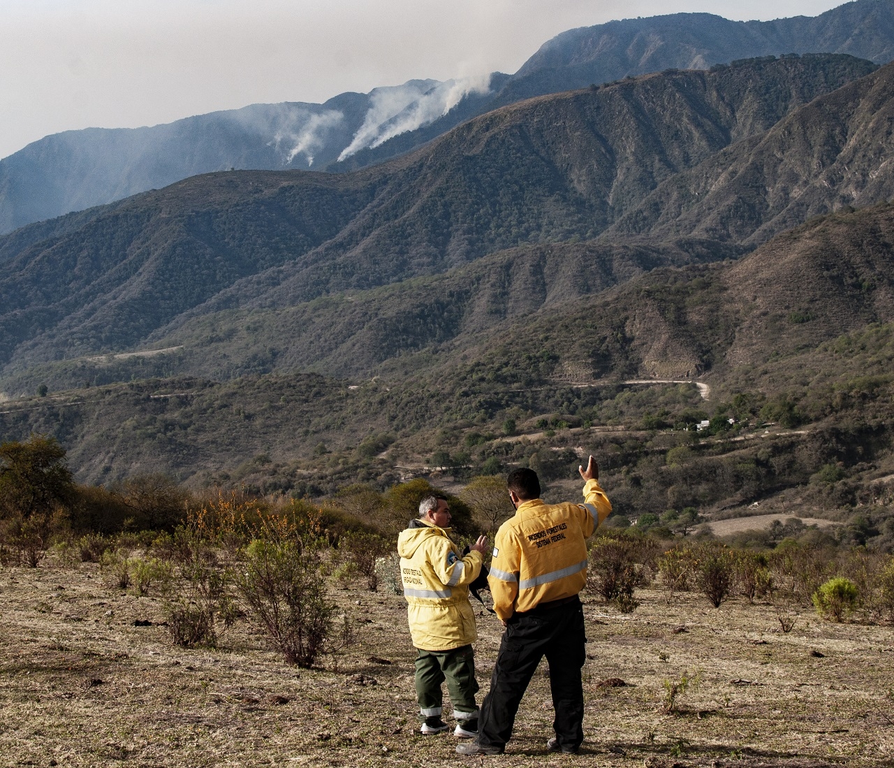 El monitoreo se realizó más precisamente en la localidad de Las Higuerillas, desde donde se observa un incendio forestal que desciende por la ladera del cerro conocido como “El Quico”, en el límite natural con la vecina provincia de Tucumán.