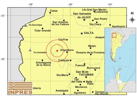 Epicentro: 153 km al SO de Salta; 197 km al NO de San Miguel De Tucumán; 41 km al O de Angastaco -25.622 (lat) -66.661 (long)