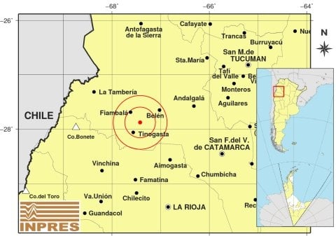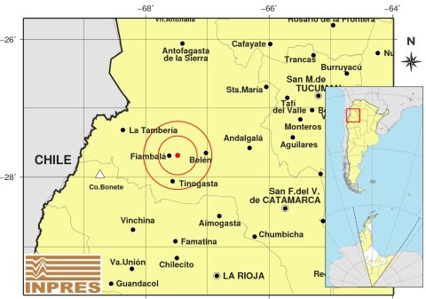 Epicentro: 177 km al O de San F. Del Valle De Catamarca; 179 km al N de La Rioja; 24 km al NE de Tinogasta -27.879 (lat) -67.422 (long)