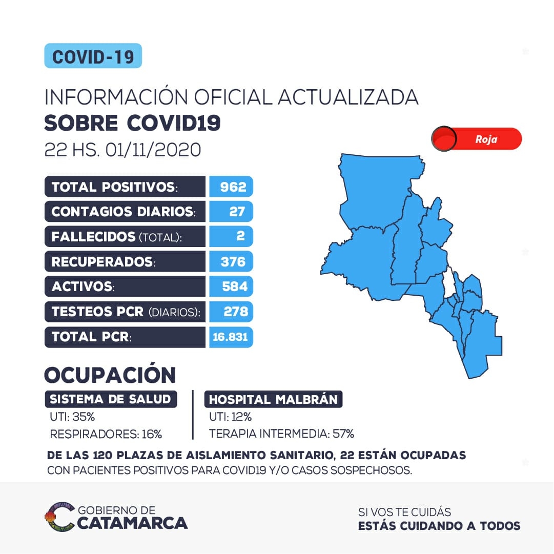 Hasta las 22 horas del domingo 1 de noviembre, se han detectado 27 nuevos casos positivos de coronavirus en la provincia de Catamarca. El total acumulado de casos positivos detectados asciende a 962.