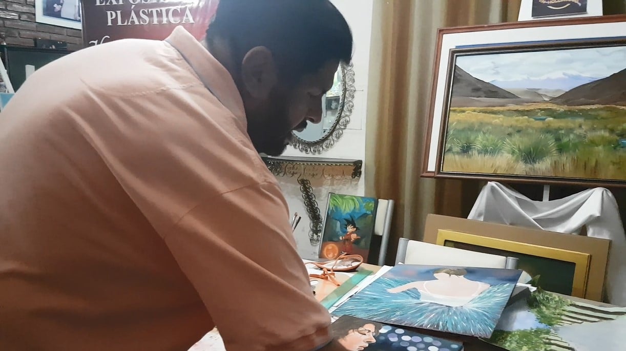 En su atelier, sobran los pinceles y colores, pero también se respira el arte que se desliza en cada una de sus piezas dispersas en el lugar. Miguel Castro González, un artista plástico con 12 años de trayectoria profesional que deja en deja en sus cuadros toda su pasión por el arte y la emoción de ser catamarqueño.