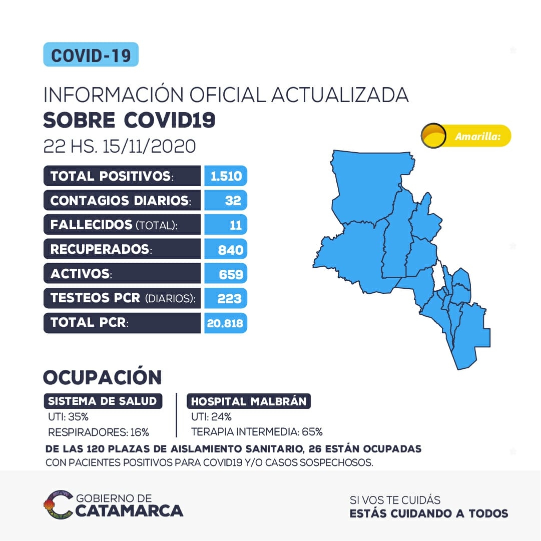 Hasta las 22 horas del domingo 15 de noviembre, se han detectado 32 nuevos casos positivos de coronavirus en la provincia de Catamarca. El total acumulado de casos positivos detectados asciende a 1510.