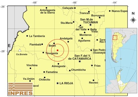 Epicentro: 122 km al NO de San F. Del Valle De Catamarca; 161 km al N de La Rioja; 38 km al SE de Belén -27.960 (lat) -66.849 (long)