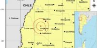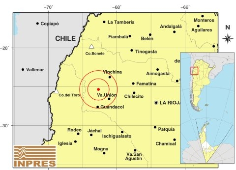Epicentro: 169 km al O de La Rioja; 270 km al N de San Juan; 47 km al NO de Va.Union -29.074 (lat) -68.538 (long)