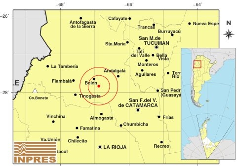 Epicentro: 131 km al NO de San F. Del Valle De Catamarca; 174 km al N de La Rioja; 25 km al SE de Belén -27.838 (lat) -66.881 (long)