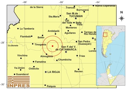 Epicentro: 79 km al NO de San F. Del Valle De Catamarca; 142 km al N de La Rioja; 54 km al NE de Aimogasta -28.168 (lat) -66.476 (long)