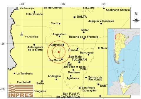 Epicentro: 111 km al NO de San Miguel De Tucumán; 189 km al SO de Salta; 38 km al NO de Sta.Maria -26.377 (lat) -66.199 (long)